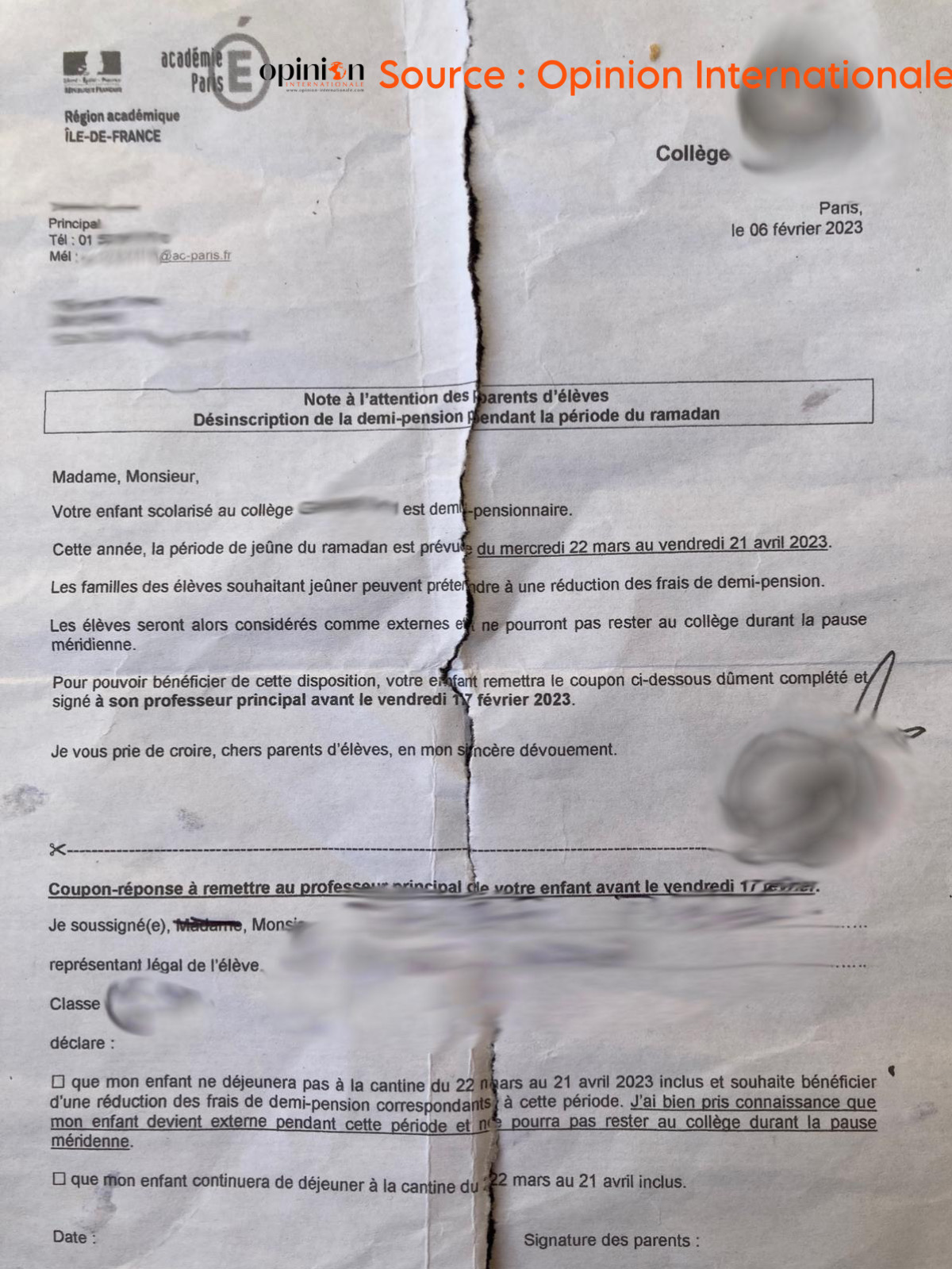Opinion Internationale révèle, sans qu’il soit possible de dire si cela concerne toute l’académie de Paris voire toute la France (Monsieur le ministre Pap Ndiaye pourra nous le dire) que des élèves des collèges publics parisiens ont reçu une circulaire [notre photo] les invitant à bénéficier d’une réduction des frais de demi-pension en cas d’observance du ramadan.
