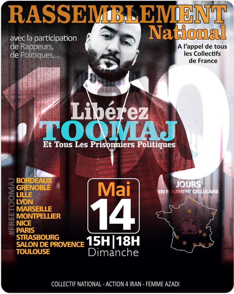 Le 14 mai 2023, dans plus d’une quinzaine de villes* en France et dans le monde, une grande manifestation sera organisée en soutien aux prisonniers politiques iraniens dont, le plus emblématique d’entre eux, le rappeur Toomaj Salehi.
