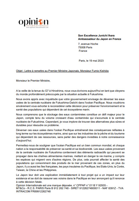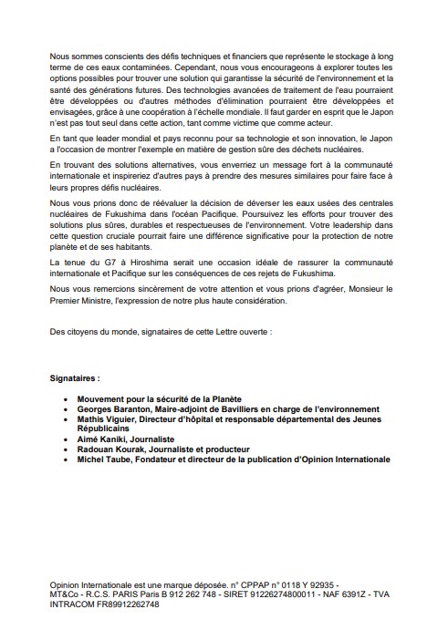 Vendredi 19 mai 2023, au moment où s’ouvrait le G7 à Hiroshima au Japon, Opinion Internationale remettait une Lettre ouverte au Premier Ministre du Japon. Signée par le Mouvement pour la sécurité de la Planète présidé par Geoffroy Gerdi, Mathis Viguier, Directeur d’hôpital et responsable départemental des Jeunes Républicains, Georges Baranton, Maire-adjoint de Bavilliers (Territoire de Belfort) en charge de l’environnement, Aimé Kaniki, Journaliste, cette adresse prolonge l’édito d’Opinion Internationale et la pétition lancée sur Opinions.com.