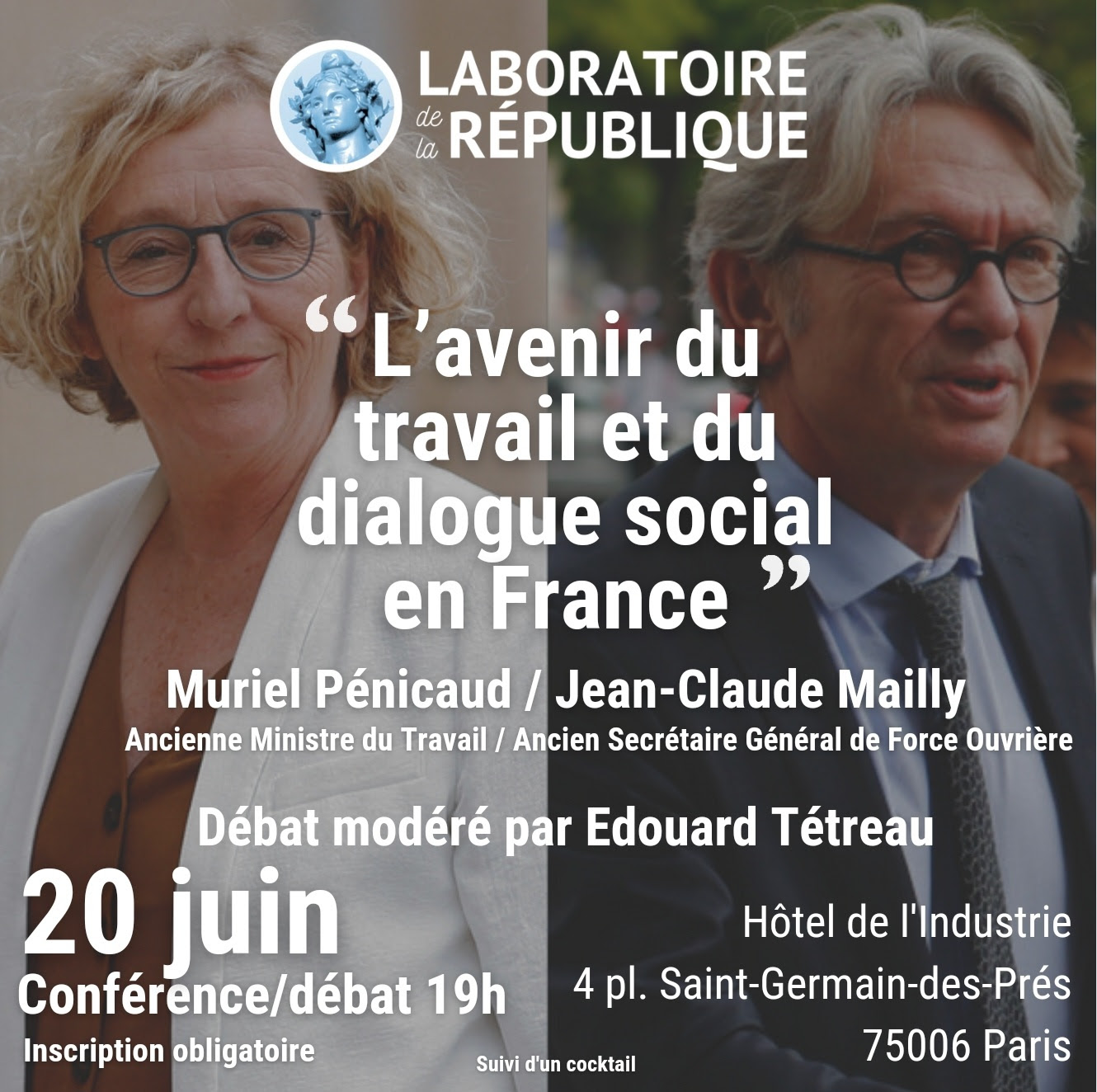 Comment revitaliser le dialogue social au sein de l’entreprise ? Quelles perspectives pour un monde du travail en profonde évolution ? Le Laboratoire de la Républiquedonne la parole à Muriel Pénicaud, ancienne ministre du Travail et Jean-Claude Mailly, ancien secrétaire général de Force Ouvrière, à l’occasion d’une conférence-débat introduite par Jean-Michel Blanquer sur un thème d’une brûlante actualité : « L’avenir du travail et du dialogue social en France ».