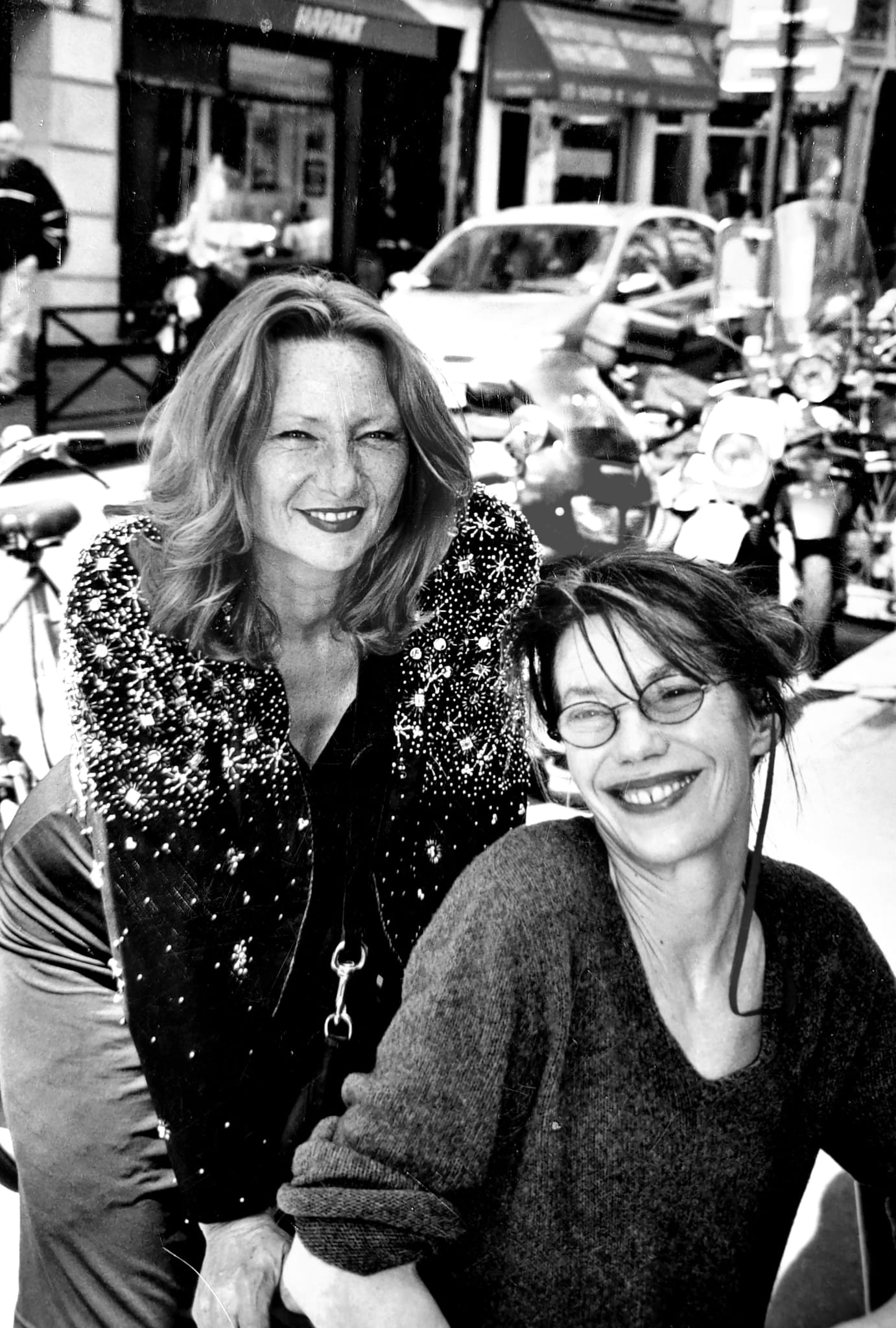 Jane Birkin à la terrasse d’un restaurant parisien de Saint-Germain-Des-Prés, à côté de la peintre et photographe Nadine Dewit, épouse de Daniel Salvatore Schiffer (copyright).