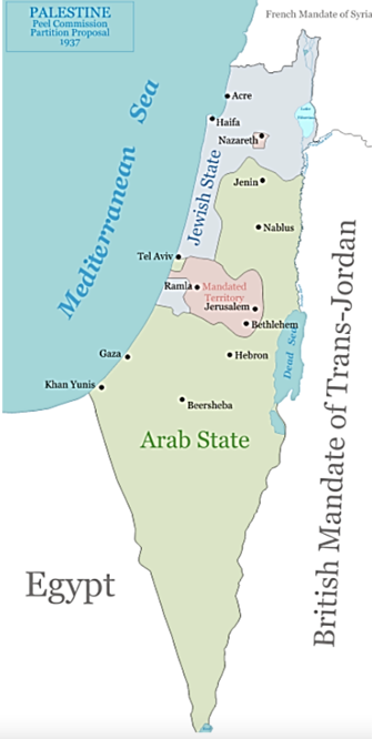 C’est la première solution dite à deux états. Après des débats intenses, les organisations juives acceptent ce découpage et la perte d’une grande partie du territoire initial. Les peuples arabes refusent violemment, très violemment cette solution à deux états, par exemple avec le pogrom d’Hébron d’aout 1929, où de nombreux juifs sont tués malgré la protection de l’armée britannique.