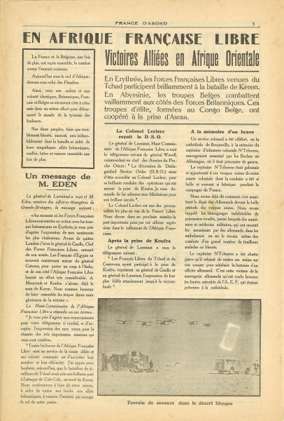 Le samedi 29 mars 1941, « France d’abord », bimensuel diffusé à Brazzaville, fit paraitre dans son n°5, page 3, sous le titre “A la mémoire d’un brave” celle du capitaine N’Tchoréré, un compte rendu du service religieux célébré en la cathédrale de Brazzaville, en présence des “hautes autorités de l’AEF”.