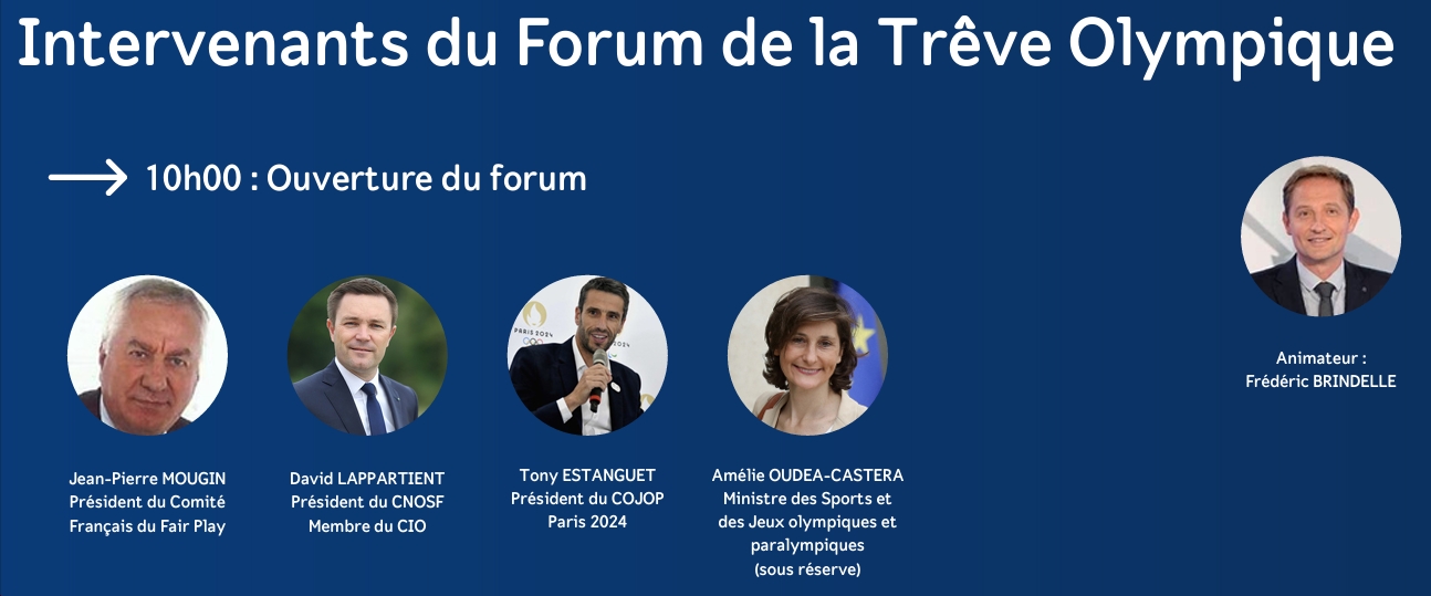 Sans naïveté mais avec la conviction que chaque progrès de la trêve sera une formidable avancée qui sauvera des vies, le Comité Français du Fair-Play (CFFP) présidé par Jean-Pierre Mougin et le Comité National Olympique et Sportif Français (CNOSF) présidé par David Lappartient organisent mardi 28 mai un Forum international intitulé « La trêve olympique pour les Jeux olympiques et paralympiques de Paris 2024 » sous le haut patronage d’Emmanuel Macron.