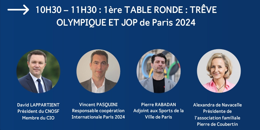 - « TRÊVE OLYMPIQUE ET JO de Paris 2024 » (10h30-11h30) : « Le sport, outil fédérateur depuis plus de 2 millénaires, a souvent contribué à réunir les peuples. Malheureusement, malgré la déclaration de l’ONU fin 2021 sur la Trêve Olympique, la Russie est entrée en guerre avec l’Ukraine juste avant la fin des Jeux de Pékin 2022. L’ONU a adopté le mardi 21 novembre 2023, une résolution de paix appelant tous les pays du Monde à respecter la traditionnelle Trêve Olympique à l’occasion des JOP de Paris 2024, dans un contexte de graves conflits internationaux. Quelles conséquences pour les JOP de Paris ? »