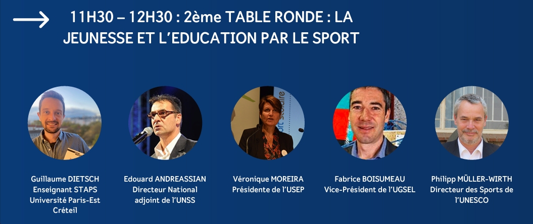 - « LA JEUNESSE ET L’EDUCATION PAR LE SPORT » (11h30-12h30) : « La jeunesse du 21e siècle semble désorientée. Elle accuse une perte de repères significative dans de nombreux domaines : un désintérêt dans la vie politique, un désengagement dans la vie citoyenne et un manque de confiance dans l’avenir. Toutefois, avec le sport, les valeurs universelles d’amitié, de respect et de dépassement de soi demeurent. Quelles sont les tendances actuelles ou de demain et comment les jeunes doivent-ils se construire et construire l’héritage de Paris 2024 pour un monde meilleur ? »