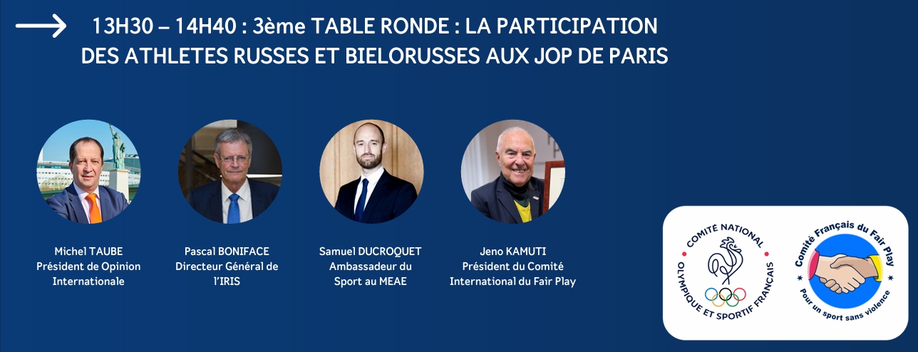- « LA PARTICIPATION DES ATHLETES RUSSES ET BIELORUSSES AUX JOP DE PARIS » (13h30-14h30) à laquelle participera Michel Taube aux côtés de Pascal Boniface, Samuel Ducroquet et Jeno Kamuti : « Depuis le début de la guerre en Ukraine, la participation des athlètes russes et biélorusses aux JOP de Paris 2024 fait débat. Le CIO a décidé que ces athlètes pourront participer, mais sous bannière neutre alors que certaines fédérations internationales leur ont fermé la porte. Quels commentaires sur cette situation et quelles conséquences sur les JOP de Paris ? »