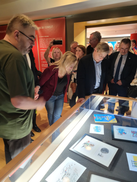 Il nous a semblé important d’associer les scolaires à cette exposition car outre le fait qu’elle traite d’un sujet d’actualité et d’histoire immédiate, elle ouvre la question du dessin de presse et de la liberté d’expression en période de conflit. Il s’agit en outre d’un thème, celui de la liberté d’expression, qui fait partie des enseignements des élèves.