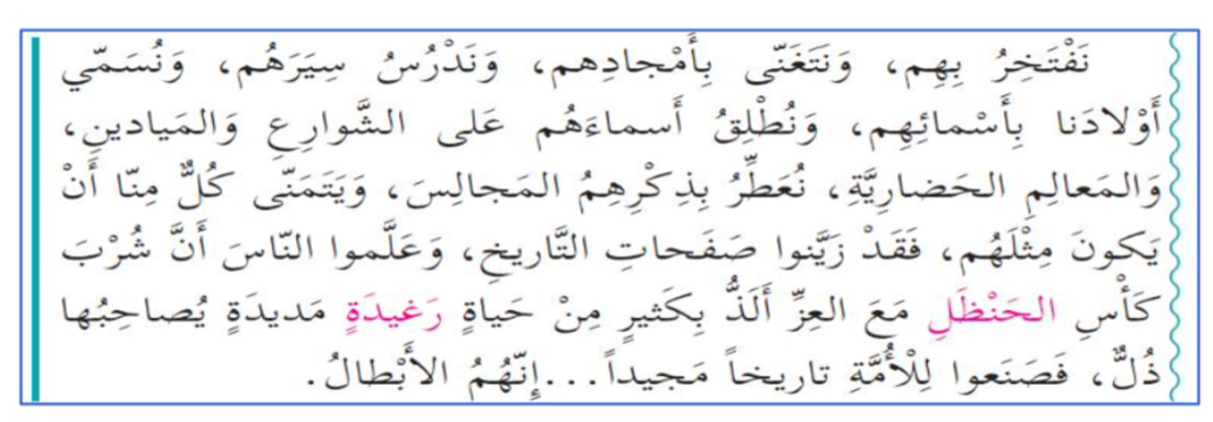 « Nous sommes fiers d’eux, nous chantons leurs exploits, nous étudions leur histoire, nous donnons leurs noms à nos enfants, à nos rues, à nos places et à nos lieux culturels. Nous parfumons nos assemblées de leur mémoire, et chacun de nous souhaite leur ressembler. Ils ont décoré́ les pages de l’Histoire. Ils ont enseigné que boire la coupe de l’amertume avec gloire est bien plus doux qu’une longue vie agréable accompagnée d’humiliations. De fait, ils ont créé une Histoire nationale illustre. Ce sont les héros. » Langue arabe, CM2, vol. 1, 2020, p. 15.