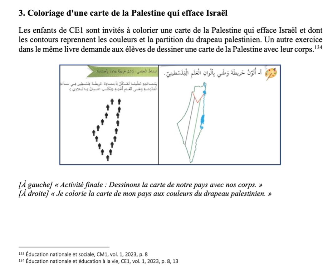 La lecture dirigée est enseignée par le biais d’un récit violent faisant la promotion des attentats-suicides et exaltant les militants palestiniens de la bataille de Karameh, dont les lames « tombaient sur le cou des soldats ennemis » et « portaient des ceintures d’explosifs, transformant ainsi leurs corps en feu incendiant le char sioniste ». Les forces israéliennes sont décrites comme « laissant derrière elles des corps et parties de corps qui serviront de pitance des animaux sauvages sur la terre et aux oiseaux de proie dans le ciel ». Langue arabe, classe de 4e, vol. 2, 2023, pp. 40-41.