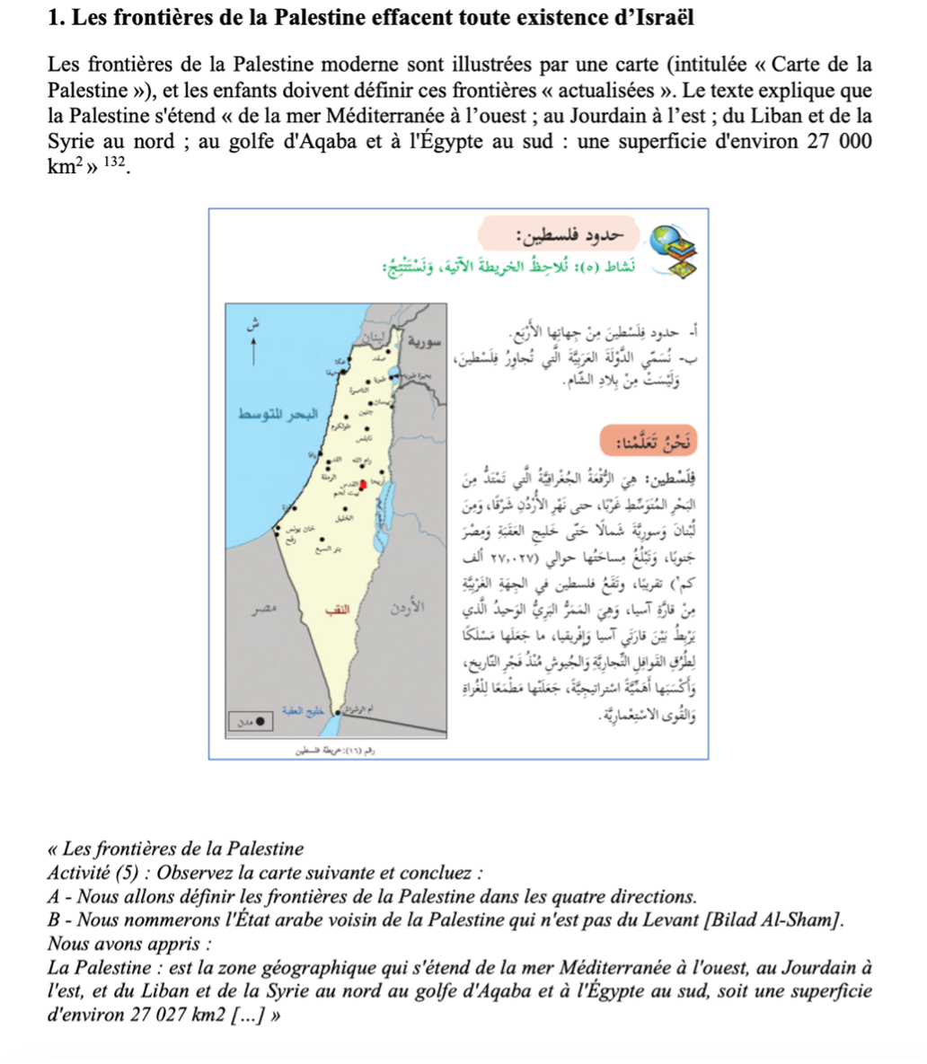 La lecture dirigée est enseignée par le biais d’un récit violent faisant la promotion des attentats-suicides et exaltant les militants palestiniens de la bataille de Karameh, dont les lames « tombaient sur le cou des soldats ennemis » et « portaient des ceintures d’explosifs, transformant ainsi leurs corps en feu incendiant le char sioniste ». Les forces israéliennes sont décrites comme « laissant derrière elles des corps et parties de corps qui serviront de pitance des animaux sauvages sur la terre et aux oiseaux de proie dans le ciel ». (Langue arabe, classe de 4e, vol. 2, 2023, pp. 40-41.)