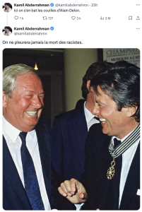 Le discours d’Abderrahman est pernicieux, empreint de mépris et de haine comme l’attestent ses derniers tweets sur Alain Delon : il n’hésite pas à brandir des accusations d’islamophobie à tout-va, qualifiant la France de pays le plus islamophobe au monde, tout en se réfugiant derrière une victimisation calculée. Il ne cesse d’affirmer que le conflit israélo-palestinien est un « génocide de la population Ghazaoui », tout en occultant les menaces constantes des voisins d’Israël qui ont juré sa disparition. Ce deux poids deux mesures dans son discours révèle une incohérence flagrante et un parti pris extrême.
