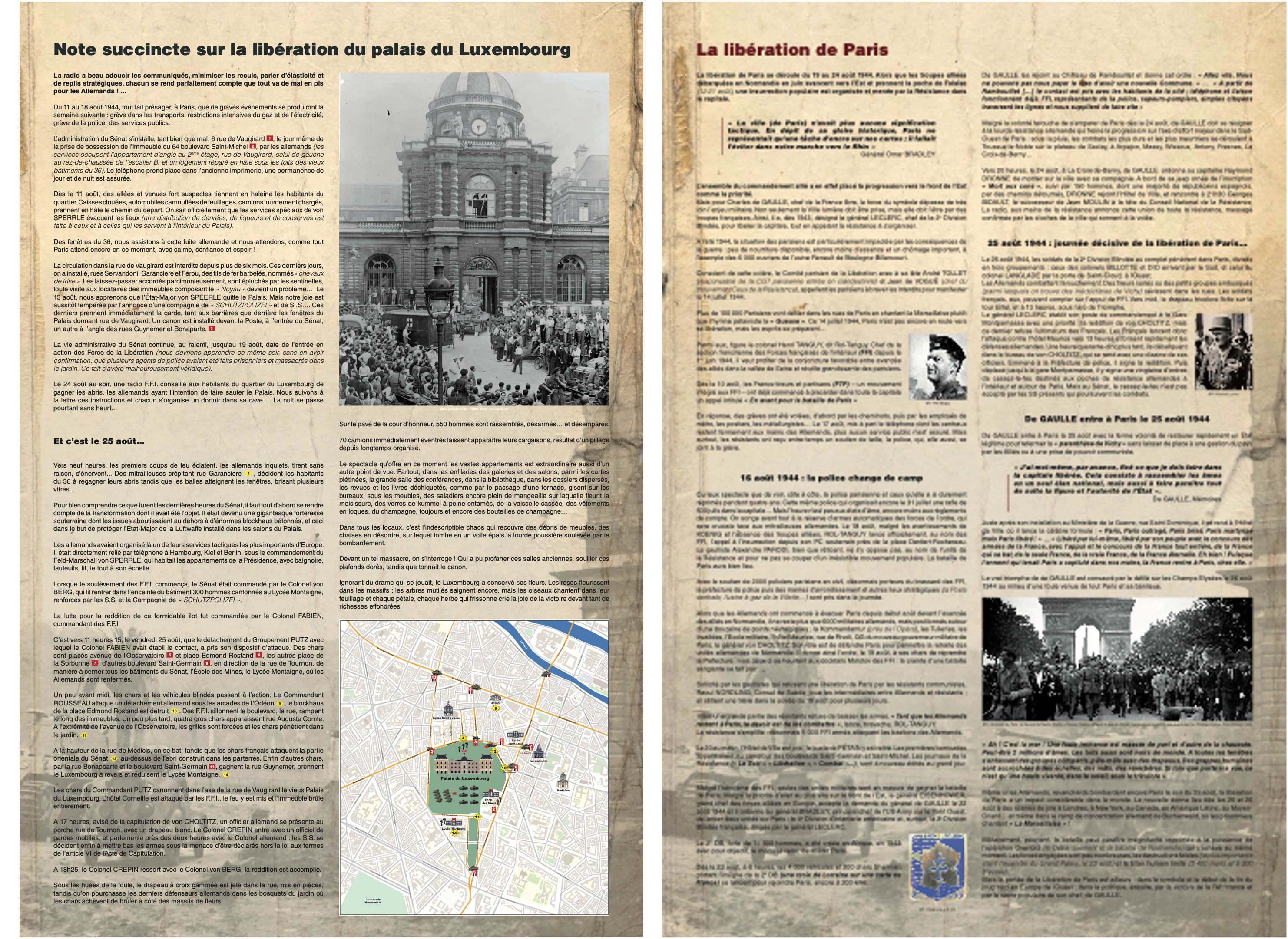 Et parmi ces lieux symboliques, le Palais du Luxembourg siège du Sénat fut utilisé par l’armée nazie comme état-major général de la Luftwaffe pour tout le front de l’Ouest. Transformé, fortifié, le Palais du Luxembourg est une place forte de la défense qu’il est nécessaire de reconquérir pour libérer Paris.