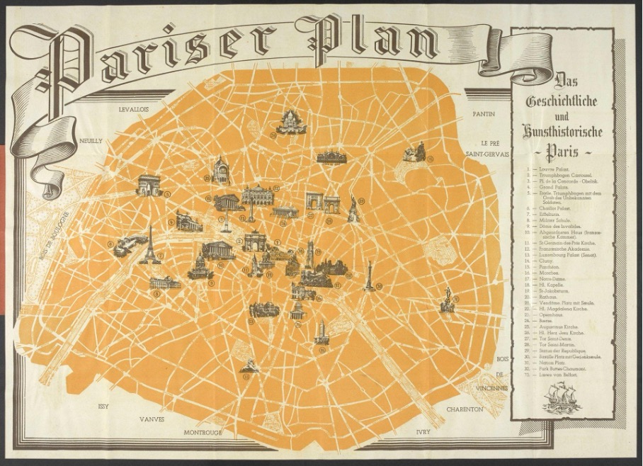 Paris, avec ses lieux emblématiques dont tous les lieux de pouvoirs, représente aussi bien pour les Allemands que les Français une prise stratégique (illustration carte Parizer Plan).