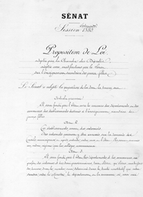 Elle fait l’objet d’un rapport présenté par Paul Broca et publié au Journal officiel du 19 juillet 1880. Ce projet est discuté en séance publique devant la Haute Assemblée les 20 et 22 novembre 1880. Une seconde délibération se déroule les 9 et 10 décembre 1880 et se termine par l’adoption de ce texte.