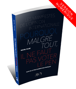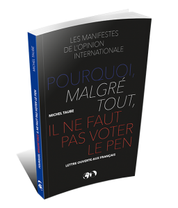 Rien n’est joué pour le 7 mai ! Le Pen peut gagner ou réaliser un score très serré ! Il nous faut donc rappeler et partager avec tous nos concitoyens tentés de s’abstenir ou de voter blanc les raisons de ne pas voter Le Pen… Recevez GRATUITEMENT « Le jour d’après », extrait du livre de Michel Taube, « pourquoi, malgré tout, il ne faut pas voter Le Pen ». |