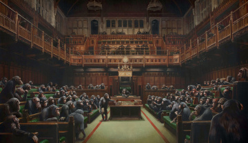 En plein débat sur le Brexit, une toile du street artiste Banksy représentant le Parlement britannique peuplé de singes a été vendue à Londres