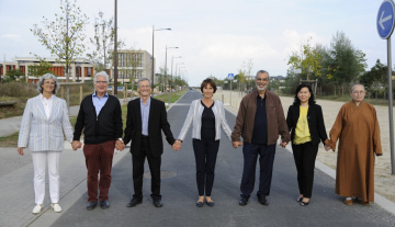 Les représentants des six cultes de Bussy-Saint-Georges posent devant l’Esplanade des religions.