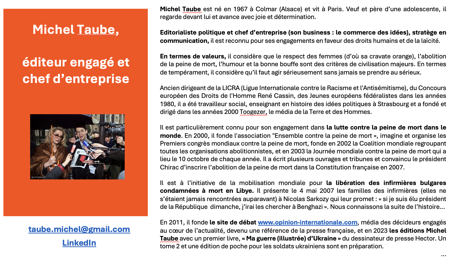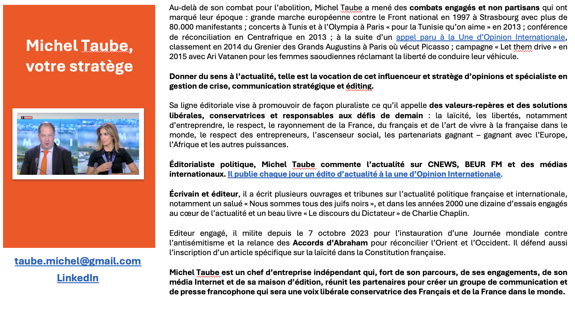 Michel Taube est le fondateur de www.opinion-internationale.com, le média des décideurs engagés au coeur de l’actualité. Il est aussi écrivain et éditorialiste politique dans les médias. Chef d’entreprise indépendant, il réunit les partenaires pour créer un groupe de communication et de presse francophone qui sera une voix libérale conservatrice des Français et de la France dans le monde.